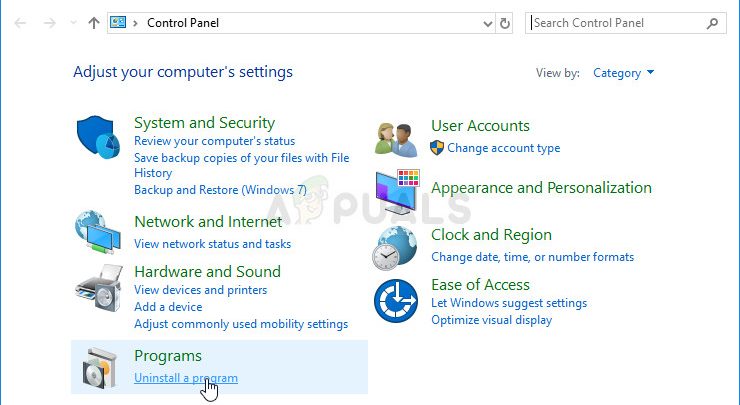 - Click on the Start menu and open Control Panel by searching for it. In Control Panel, select to View as: Category at the top right corner and click on Uninstall a Program under the Programs section.
