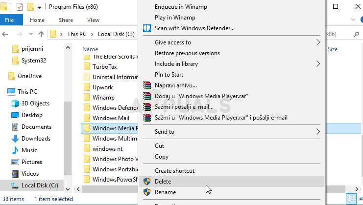 - After that, navigate to either the Program Files or Program Files (x86) folder in the paritiotion you are using (depending on your PC’s architecture) and delete the Windows Media Player folder (usually C >> Program Files >> Windows Media Player).