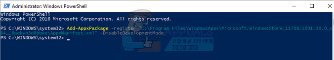 Add-AppxPackage -register “C:\Program Files\WindowsApps\ Microsoft.WindowsStore_11708.1001.30.0_x64__8wekyb3d8bbwe \AppxManifest.xml” –DisableDevelopmentMode