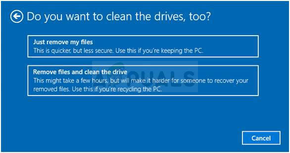 Choose Keep my files or Remove everything - Select “Just remove my files” or “Remove files and clean the drive” if you chose to “remove everything” in the prior step (not recommended). Cleaning the drive option usually takes a lot longer but it will make sure that the next person who will own your computer will have a hard time recovering your erased files. If you are keeping the computer for yourself, you should choose “Just remove my files.” If you chose to keep your files, skip this step.