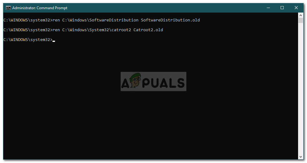 ren C:\Windows\SoftwareDistribution SoftwareDistribution.old ren C:\Windows\System32\catroot2 Catroot2.old