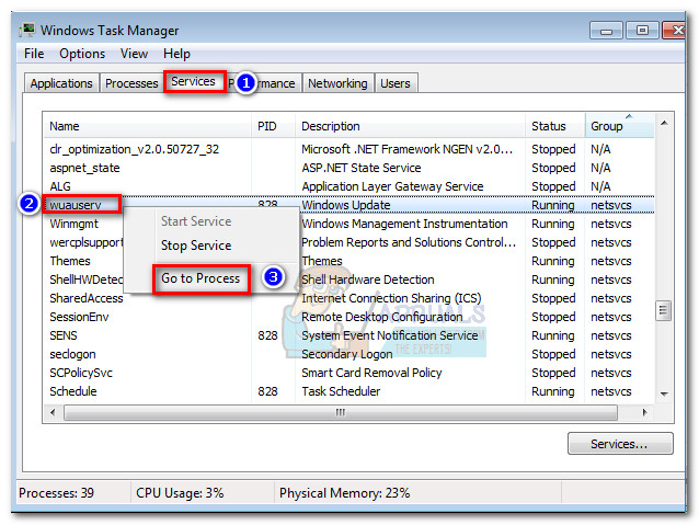 - Go to the Services tab and click on the service called Wuaserv to highlight it. Then, right-click on it and choose Go to Process. Task Manager should automatically re-open the Process tab and highlight the Svchost.exe process associated with the Windows Updates.