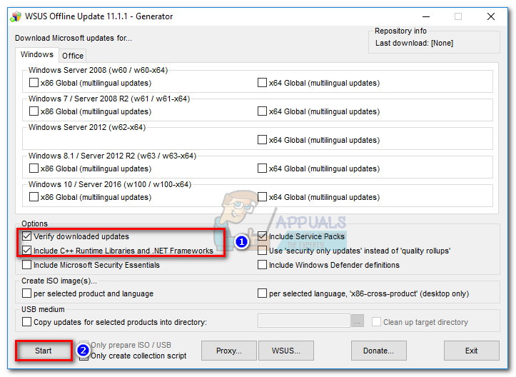 - Run the UpdateGenerator executable and check the boxes next to Verify downloaded updates and Include C++ Runtime Libraries and .Net Frameworks. Hit Start to begin downloading the missing updates.