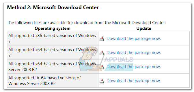 - Use this Microsoft link (here) to download the appropriate version of the SSU updated for your operating system. You can find the download links under Method 2: Microsoft Download Center.