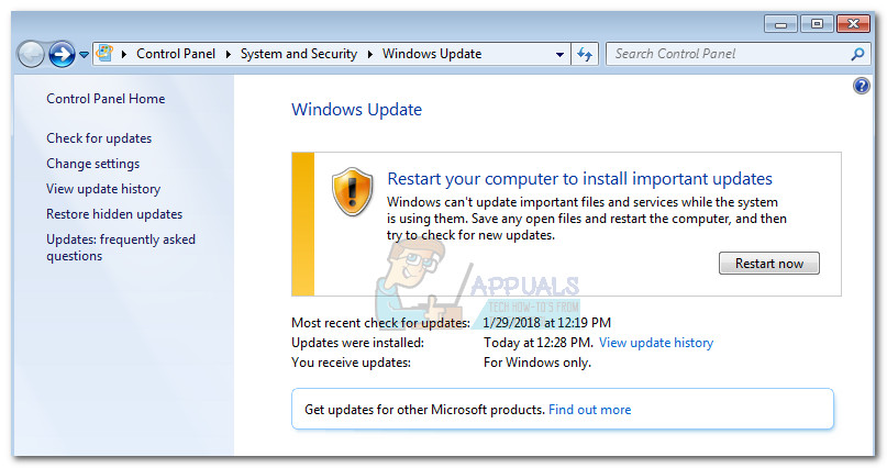 Note: On Windows 8, visit this official Microsoft link (here) and download the appropriate SSU driver based on your Windows version from under Method 2: Microsoft Download Center. - Install the SSU update and restart your system again. Then, return to Automatic Updates as we did in step 2 and re-enable Automatic Updates by setting them back to Install updates automatically.