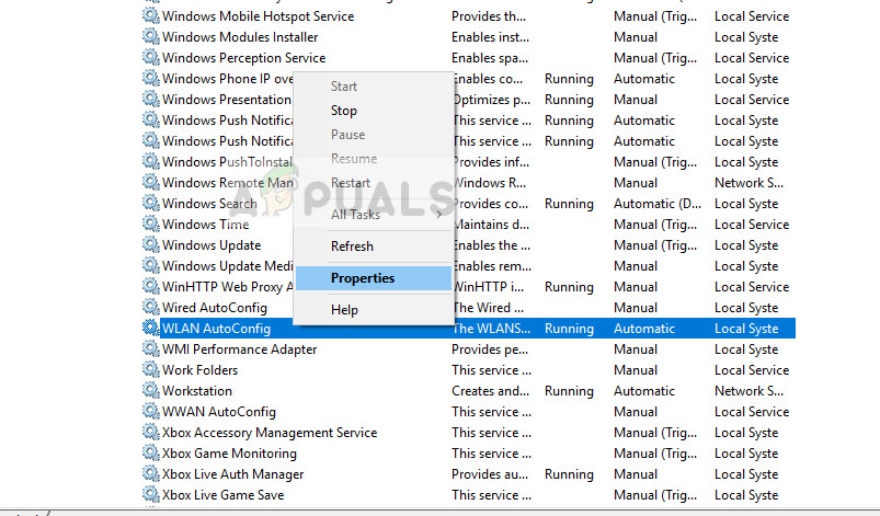 - Once in the services window, search for the entry “WLAN AutoConfig”. Right-click it and select Properties.