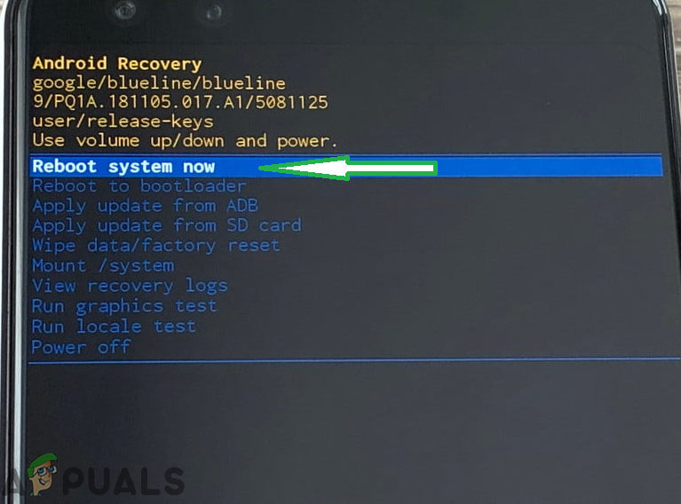Highlighting the “Reboot System Now” option and pressing the “Power” button - Press “Power” key to select the option and restart the device.