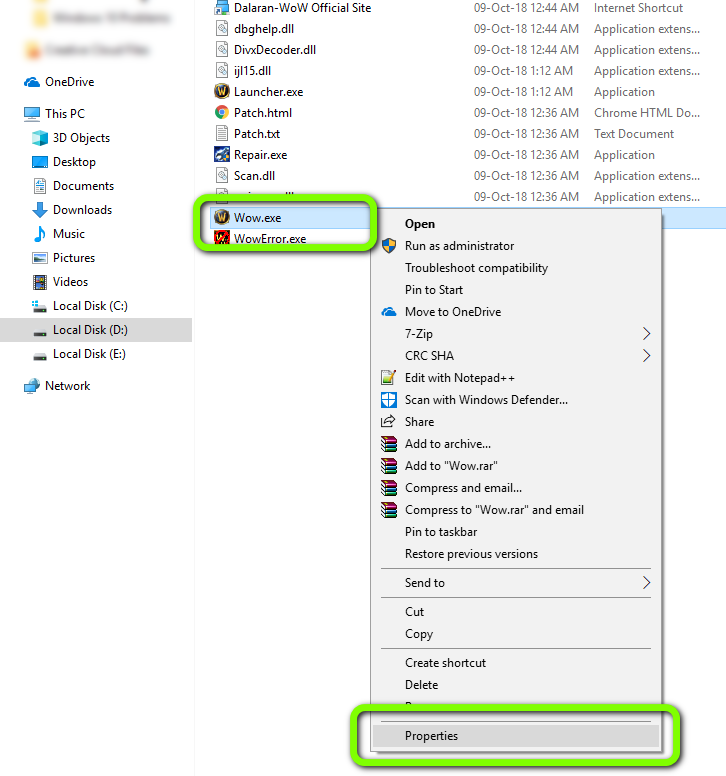 - Navigate to your World of Warcraft Directory. Once you are in the main folder, you will see an executable of ‘Wow.exe’. Right-click on it and select Properties.