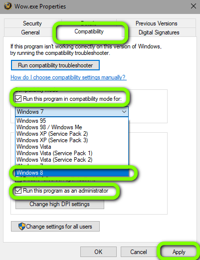 - Compatibility: WoW game executables are known to have issues with the compatibility of different versions of Windows. Changing the compatibility might help with the issue.