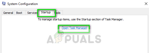 - Now navigate to the Startup tab and click the option of “Open Task Manager”. You will be redirected to the task manager where all the applications/services which run when your computer starts will be listed.