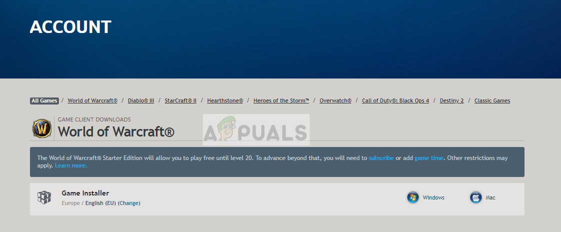 Now navigate to the Official Blizzard Download page and download the World of Warcraft client from it. After downloading the game, install it using an administrator. Restart your computer, launch the game and enter your credentials. Now check if the issue is solved.