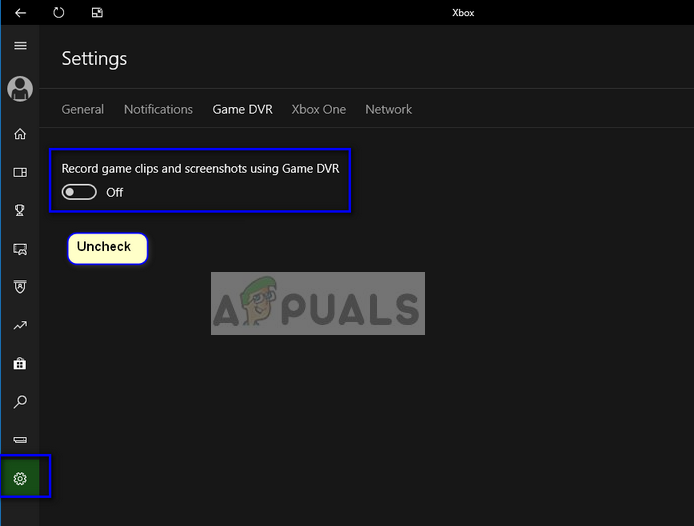 - Click on the Settings icon present at the bottom left side of the screen. Now select “Game DVR” from the list of tabs and uncheck the option ”Record game clips and screenshots using Game DVR”.