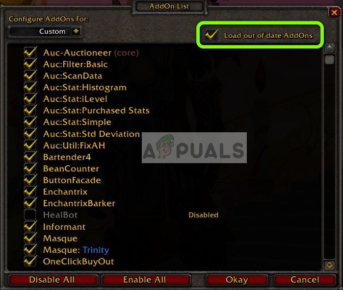World of Warcraft client has an option to automatically disregard old add-ons from your gameplay even if they work properly. This is done to increase the gaming experience and avoid any glitches or wrong data being passed on to the add-on. This is more of a formality because there are tons of out of date add-ons which work flawlessly inside the client. In this solution, we will launch the WoW client and disable the option which enforces this policy.