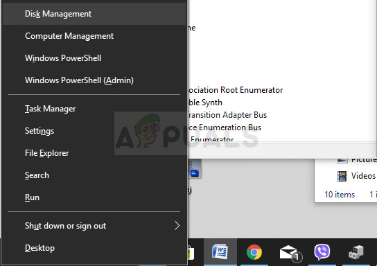 - After that, either use the Windows Key + X key combination or right-click on the Start menu and choose the Disk Management option in order to open its console.