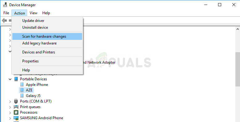 - Click on Action >> Scan for hardware changes. Windows should now proceed to download and install the driver properly again.