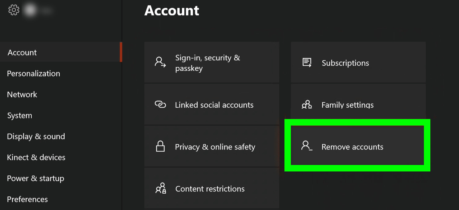 - In the right pane of Account tab, select the Remove Account and press the A button of your controller.