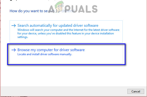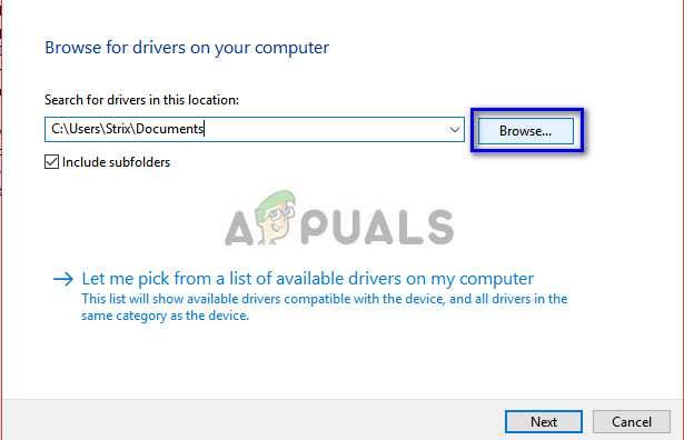 - Click on the “Browse” button and navigate to the location where you downloaded the driver. Do note that you might have to unzip the driver before you are able to select it.