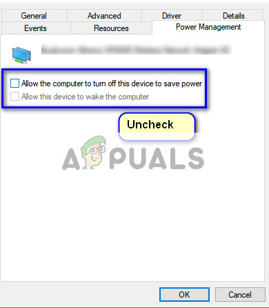 - Navigate to the “Power Management” tab and uncheck ‘Allow the computer to turn this device to save power’. Press OK to save changes and exit.