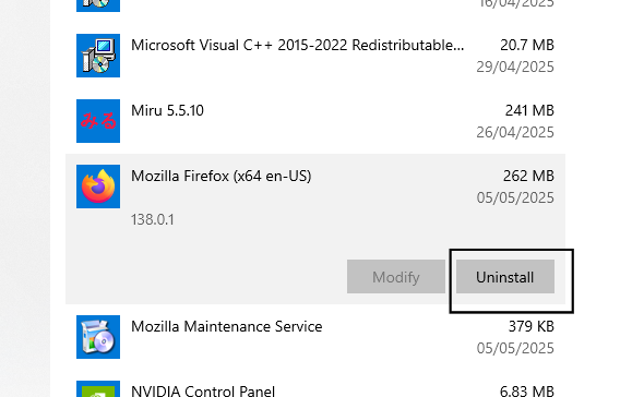 - Locate Mozilla Firefox in the programs list and click Uninstall to remove it.