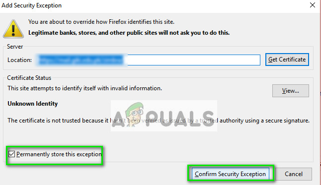 Add Exception for a Website - A new dialogue box will pop up. Confirm Security Exception after clicking the action box and see if you can access the website without any problems.