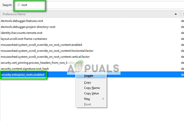 - Select the option “enterprise_roots.enabled”. Right-click it and select “Toggle”. This will enable the value which was first false.