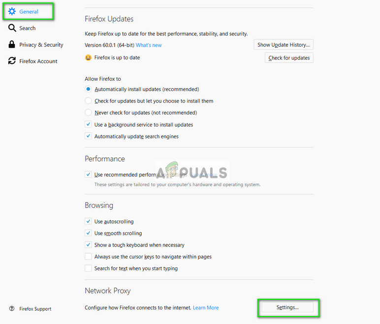 - Press the menu icon on the top-right side of the window. Now select “General” and click “Settings” under the heading of “Network Proxy”.