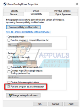 - Now browse for an exe file named as “GameOverlayUI.exe”. You should right click on it and select Properties from the list of options. Select the Compatibility tab from the top of the screen. At the bottom of the small window, you will see a checkbox which says “Run this program as administrator”. Make sure it is checked. Save changes and exit.