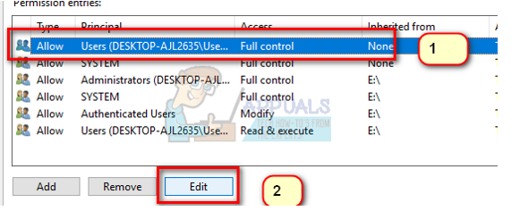 - Click on the row and click the button Edit. A window will come forward consisting of all the options in form of check boxes. Check all of them including Full Control. Click Apply, save changes, and exit. Do this for the first 4 rows and exit after changing.