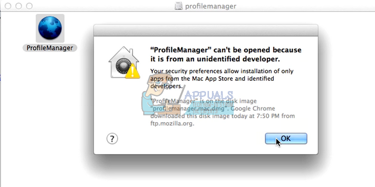 - If you encounter an error like the one below, it means you have to change preferences for applications to run when downloaded over the internet. Do note that you will require administrator privileges to change the preferences. If the application opens without any problems, skip these steps and jump to creating a new profile.
