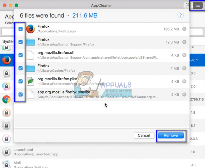 - Click on the list icon present at the top-right side of the screen to list all the applications installed on your Mac. Locate Firefox from the list and double-click it to remove. Make sure all the options are checked before clicking the button “Remove”.