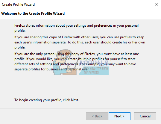 When you encounter this error in Windows OS, it means that the Firefox profile that the browser is using by default is not accessible. Now the remedy is quite easy; we will create a new profile using a run command and then launch Firefox. After Firefox is launched, we can easily use the backup utility and restore all your previous data saved on your profile. Do note that this method will require the email and password associated with Firefox.