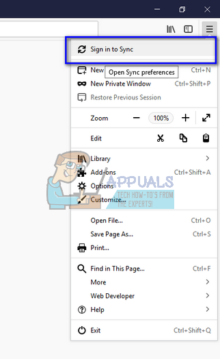 - Once in the browser, click on the menu icon present at the top-right side of the screen and select “Sign in to Sync”.