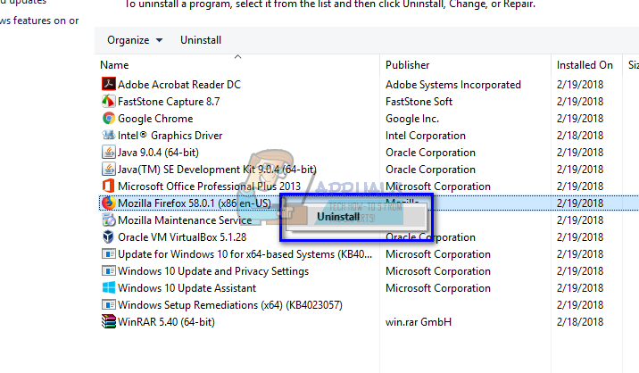 - Once in programs and features, navigate through all the list until you file Firefox. Right-click it and select “uninstall”.
