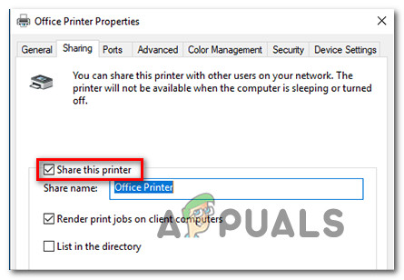 - The printer is not shared across the network – As it turns out, this issue can also occur if the device you’re trying to print from is not shared across the network. If this scenario is applicable, you can resolve the issue by making the printer sharable from the Printer’s properties menu.