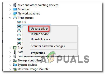 Running Device Manager - Expand the drop-down menu associated with Printers (or Print Queues). Then, right-click on the printer that you’re having issues with and choose Uninstall device. You’ll need to confirm once again before the driver is uninstalled.