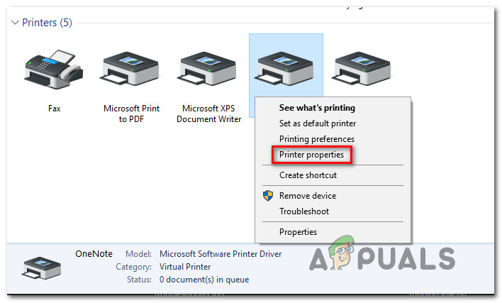 Accessing the Device & Printers screen - Inside the Device and Printers screen, right-click on the printer that you’re having issues with and choose Printer Properties.