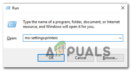 - Press Windows key + R to open up a Run dialog box. Then, type “ms-settings:printers” and press Enter to open the Printers & scanners tab of the Settings app.