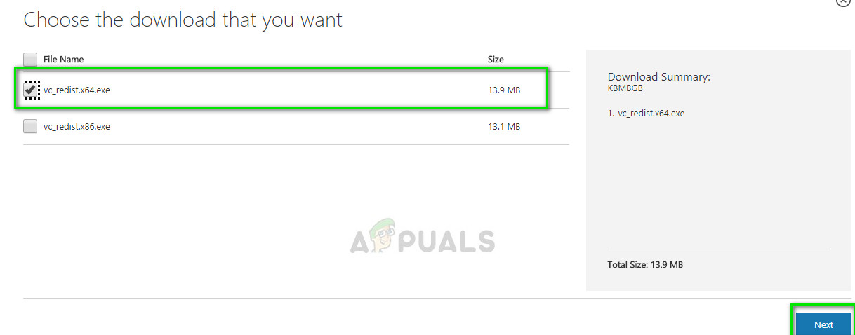 - Select “vc_redistx64.exe” and press Next. Soon after the download will commence. Save the file in an accessible location and run the exe file.