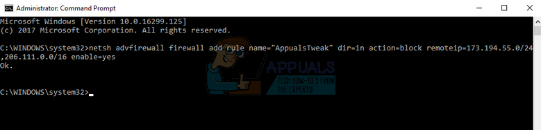 netsh advfirewall firewall add rule name=”AppualsTweak” dir=in action=block remoteip=173.194.55.0/24,206.111.0.0/16 enable=yes