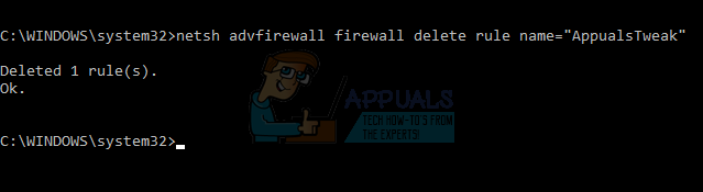 netsh advfirewall firewall delete rule name=”AppualsTweak”