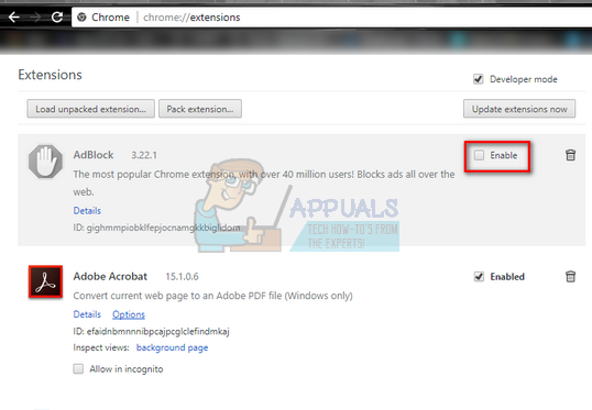 To check your browser extensions on Chrome, type “chrome://extensions” in the address bar and press Enter. You can disable any extension by unchecking the “enable” option. This will automatically disable that extension from making any changes to your UI. Restart your browser and check. Make sure to disable all adblockers. Adblockers are known to cause problems while streaming YouTube videos as it tries to remove the ads from the video and in response, the video refuses to display.