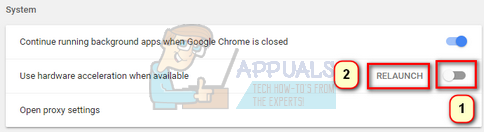 Open Advanced Settings of Chrome - Now navigate to the end of the tab again until you find the subheading named “System“. Under it, uncheck the option which says “Use hardware acceleration when available”