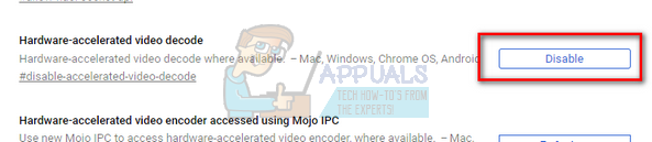 - Once in flags, navigate through them until you find “Hardware-accelerated video decode”. Click on “Disable”.