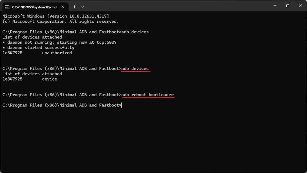 fastboot devicesto ensure your device is detected in Fastboot mode. - If it is, type