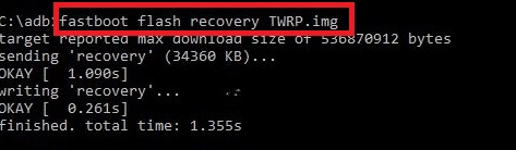 fastboot flash recovery twrp.img. This will initiate the flashing process on your device.