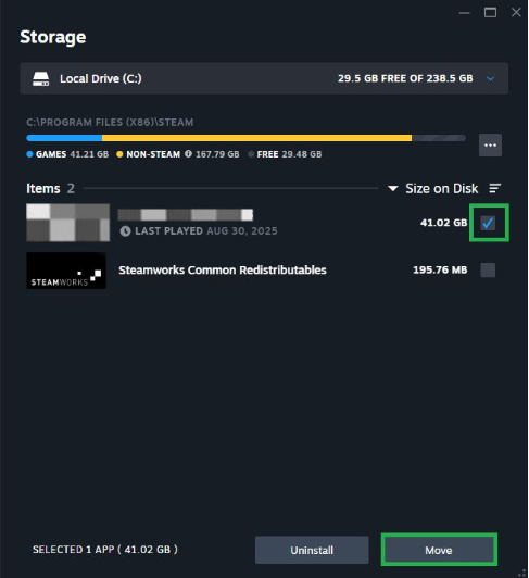 - Check the box next to the game and click Move.