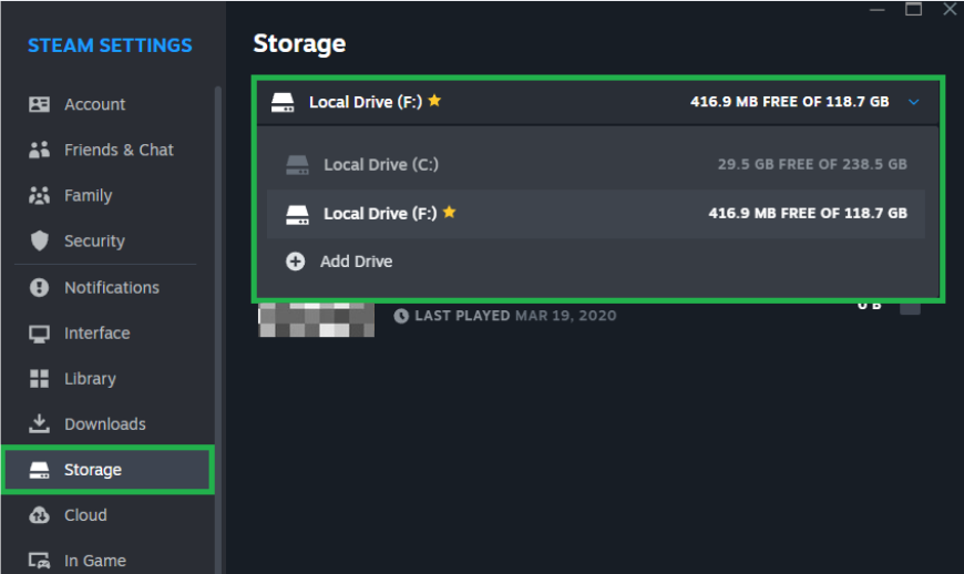 - Go to the Storage tab and select a different drive.