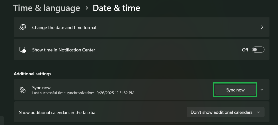 - Click Sync now to synchronize your system clock with Windows’ time server.