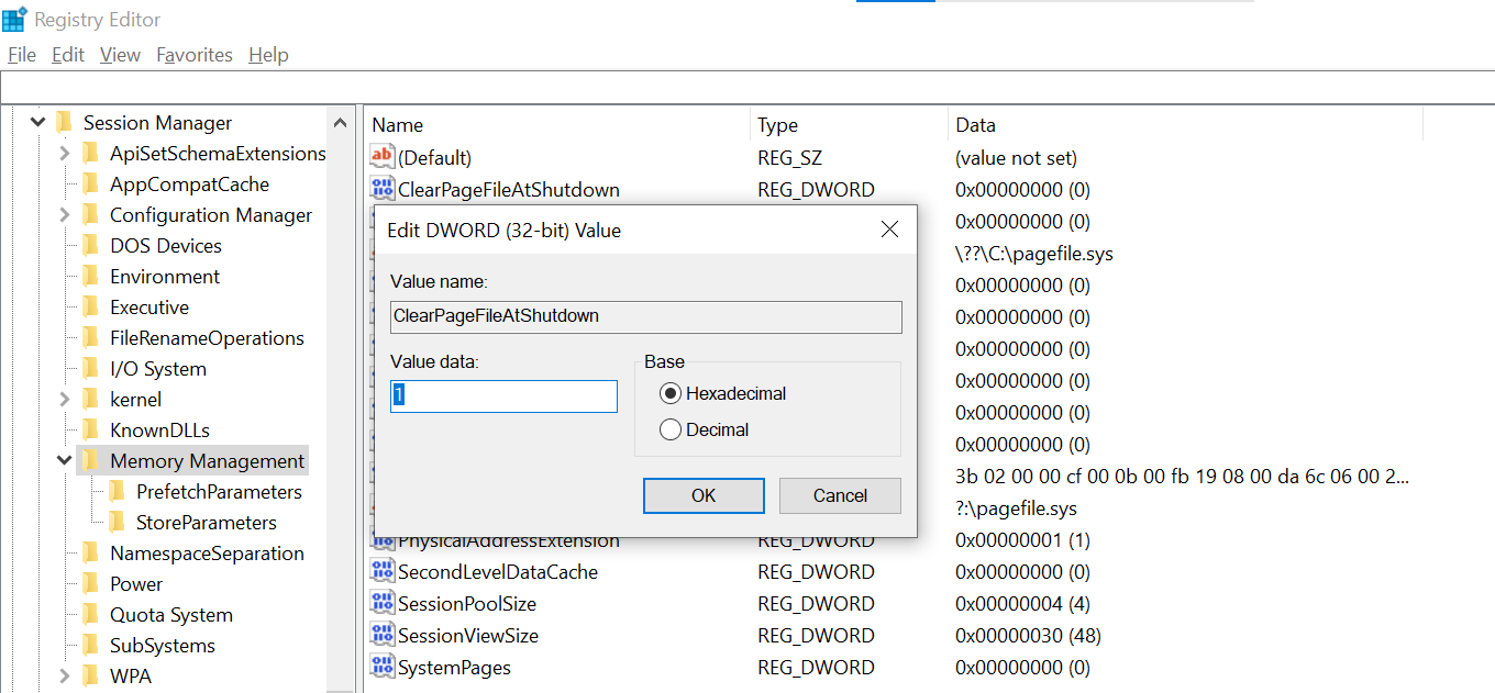 Check the box labeled “ClearPageFileAtShutdown“. Type “1” into the “Value Data” box, and then choose “OK”. Clean PageFile at Shutdown