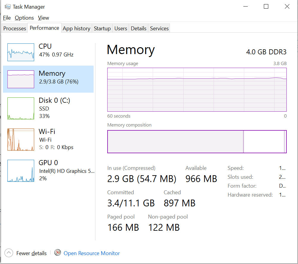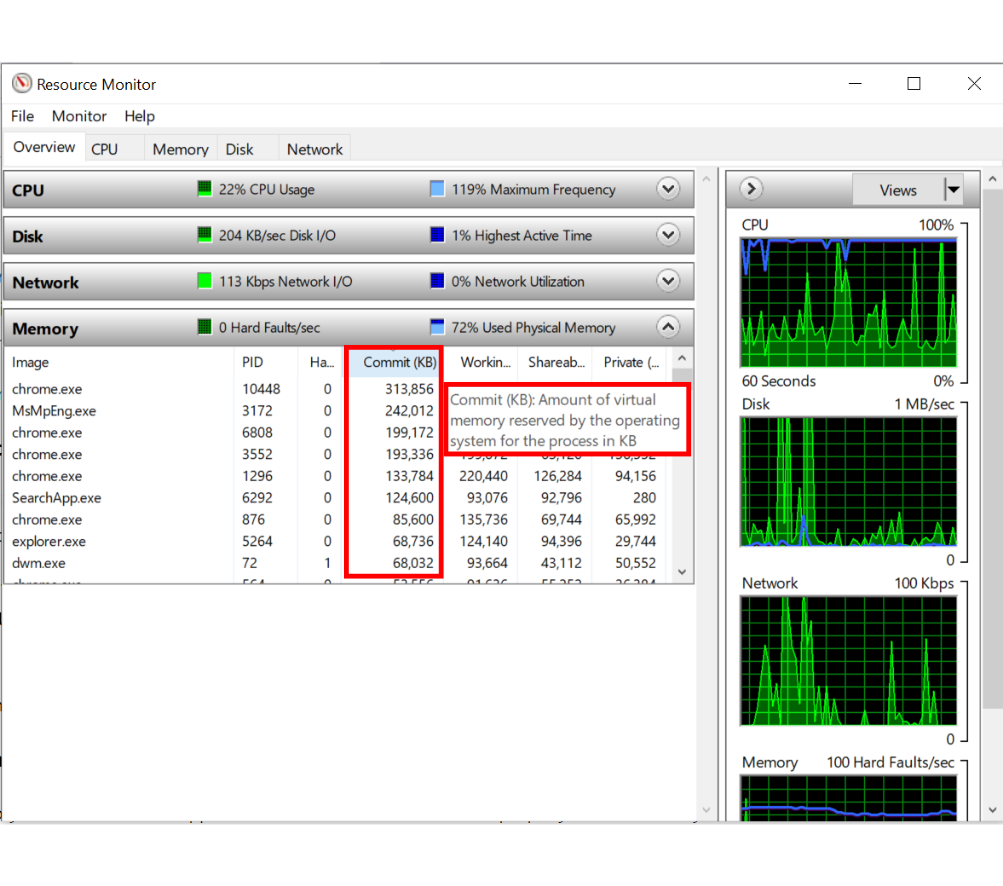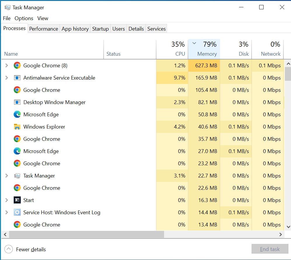 Windows has features to let you see what programs are using how much resources. Task Manager allows you to monitor each process individually and determine the exact amount of system RAM it is currently consuming. Start by searching for “Task Manager” in the Start menu. Alternatively, you can also use the keyboard shortcut Ctrl + Shift + Esc to open it. Windows Task Manager: Arranged by CPU Load Next, click on the “Memory” column heading in the “Processes” tab to arrange running programs in descending order of memory consumption. Windows Task Manager: Arranged by Memory Load Next, click on the programs that are using the most memory, and click “End Task“. This will eliminate those programs and help you free up RAM. End Task via Windows Task Manager Keep in mind that more RAM is required for more resource-intensive applications, so high RAM usage may not necessarily indicate a problem. A graph can show your RAM use over time. Head over to “Performance” tab and click “Memory“. Windows Task Manager: Memory Section To learn more about this tool’s Memory settings, click “Open Resource Monitor” at the bottom. The amount of available RAM can be seen in the accompanying graph. To quickly identify which applications use the most memory, sort the top list by “Commit (KB)“. You will see an option to terminate these applications. Windows Resource Monitor By terminating such RAM-hogging applications, you can free up some RAM easily. If you’re a pro user, and prefer an advanced version of Task Manager, you can check out Process Explorer. It’s a third-party app that does the same thing, but with much more granular control.